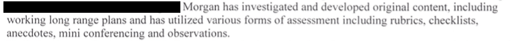 During Field III I designed a long range plan for the Geometry unit for my grade 1 students. One stand out lesson and assessment I did was a tangram class book the students helped to make. After multiple lessons learning what tangrams were and reading two books about tangrams, we read a mentor text and the students used paper tangrams and black construction paper to make a tangram shape on a page to be bound in a book they could look at for the rest of the year. By using a mentor text for a read-aloud and discussion and hands-on manipulatives, we were able to develop skills in literacy and numeracy. The text I chose reflected where they were at in their reading skills, meeting them where they are at with an age-appropriate book. I assessed their work using a checklist assessment that included a row for mini-conferencing to gather written and verbal evidence of learning. I’ve attached the lesson plan, the checklist rubric, and an excerpt from my Field III Partner Teacher assessment that touches on my assessment strategies. I’ve also included a page from my Advice For A Future (Super) Teacher book from Field II which a student made that speaks to how that student engaged in my math lessons that fostered an understanding of the intended learning outcomes.