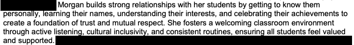 I’ve also included an excerpt from the Field III narrative assessment that my field instructor wrote for me that outlines some of the ways I build productive relationships and how I honour cultural diversity in the classroom environment I cultivate.